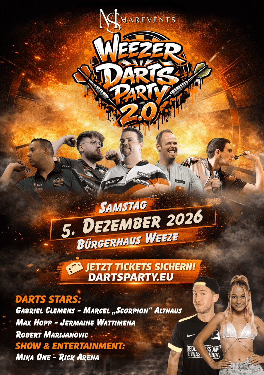 Am Freitag, den 5. Dezember 2026 verwandelt sich das Bürgerhaus Weeze in eine spektakuläre Eventlocation: Die zweite Auflage der Weezer Darts Party vereint hochkarätigen Dartsport mit einer unvergesslichen Partynacht. Erleben Sie internationale Dartprofis live auf der Bühne, feiern Sie mit bekannten Showacts und genießen Sie eine Eventatmosphäre, wie man sie sonst nur von großen TV-Events kennt.